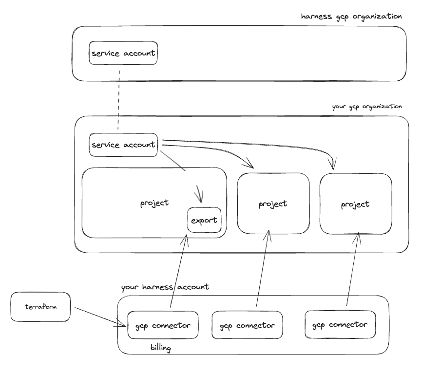 To give Harness access to billing information and resources in your GCP organization, you will need to add a Harness GCP service account to your GCP organization.