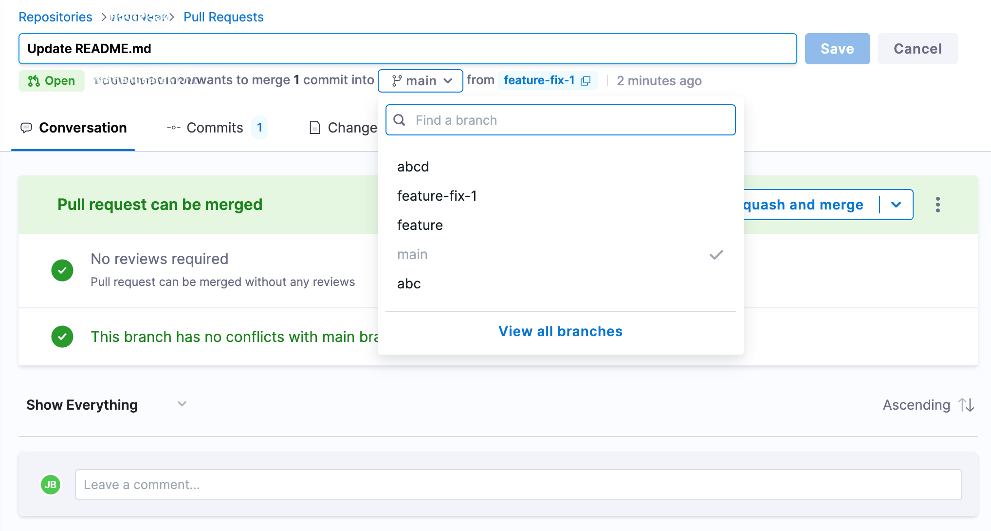 - A dropdown appears with available branches. Select the branch you want to set as the new target.