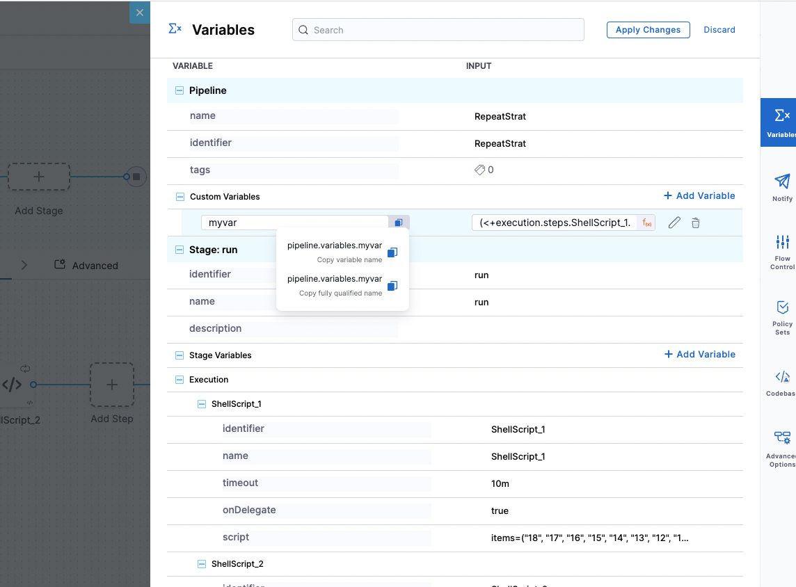The custom variable myvar contains an expression of our Output variable note that we are doing a split here :
