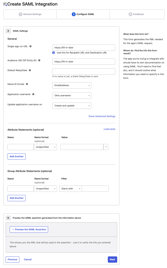 • Set a temporary Audience URI (SP Entity ID). You will also get the real value during the Split configuration and change it later.