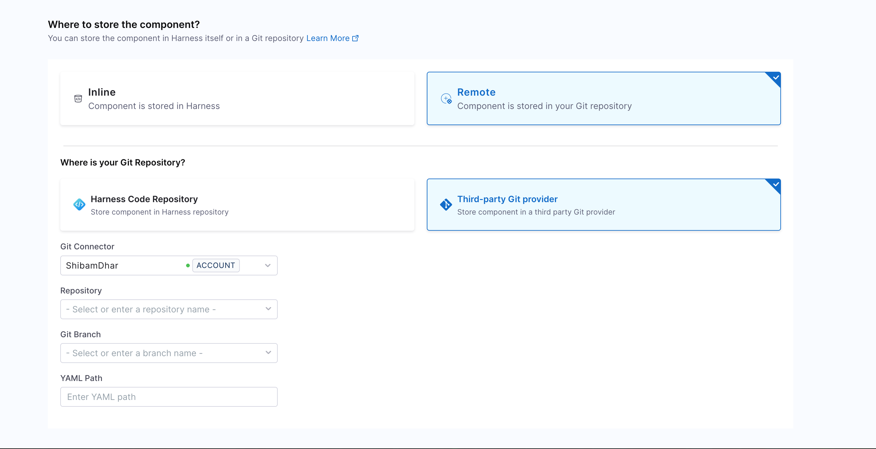 - Remote: Choose to store your Component YAML in a Git repository for version control, collaboration, and change tracking. You can either use a Harness Code Repository or connect to a Third-party Git provider like GitHub or GitLab by selecting a Git connector, repository, branch, and YAML path.