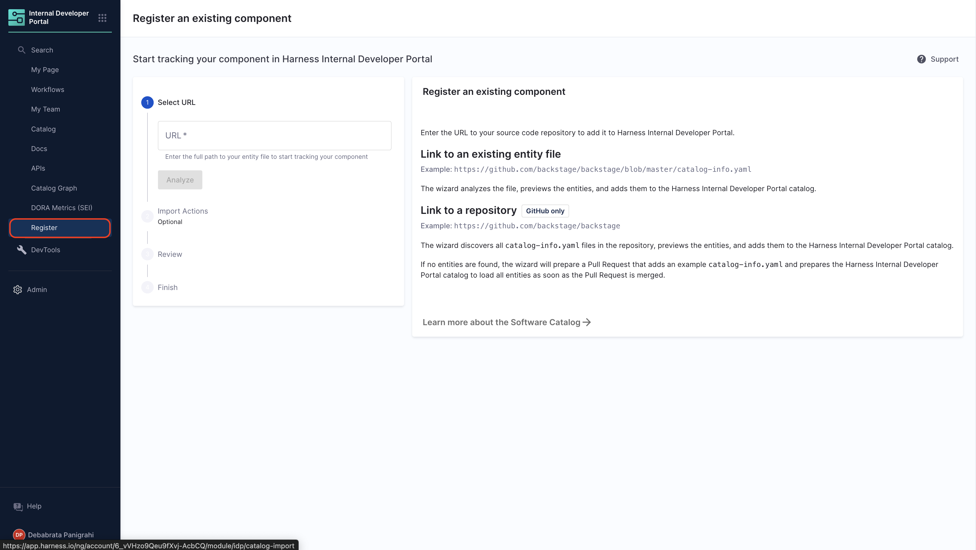 - Next, navigate to your Harness IDP module, and from the left navigation menu, select Register.