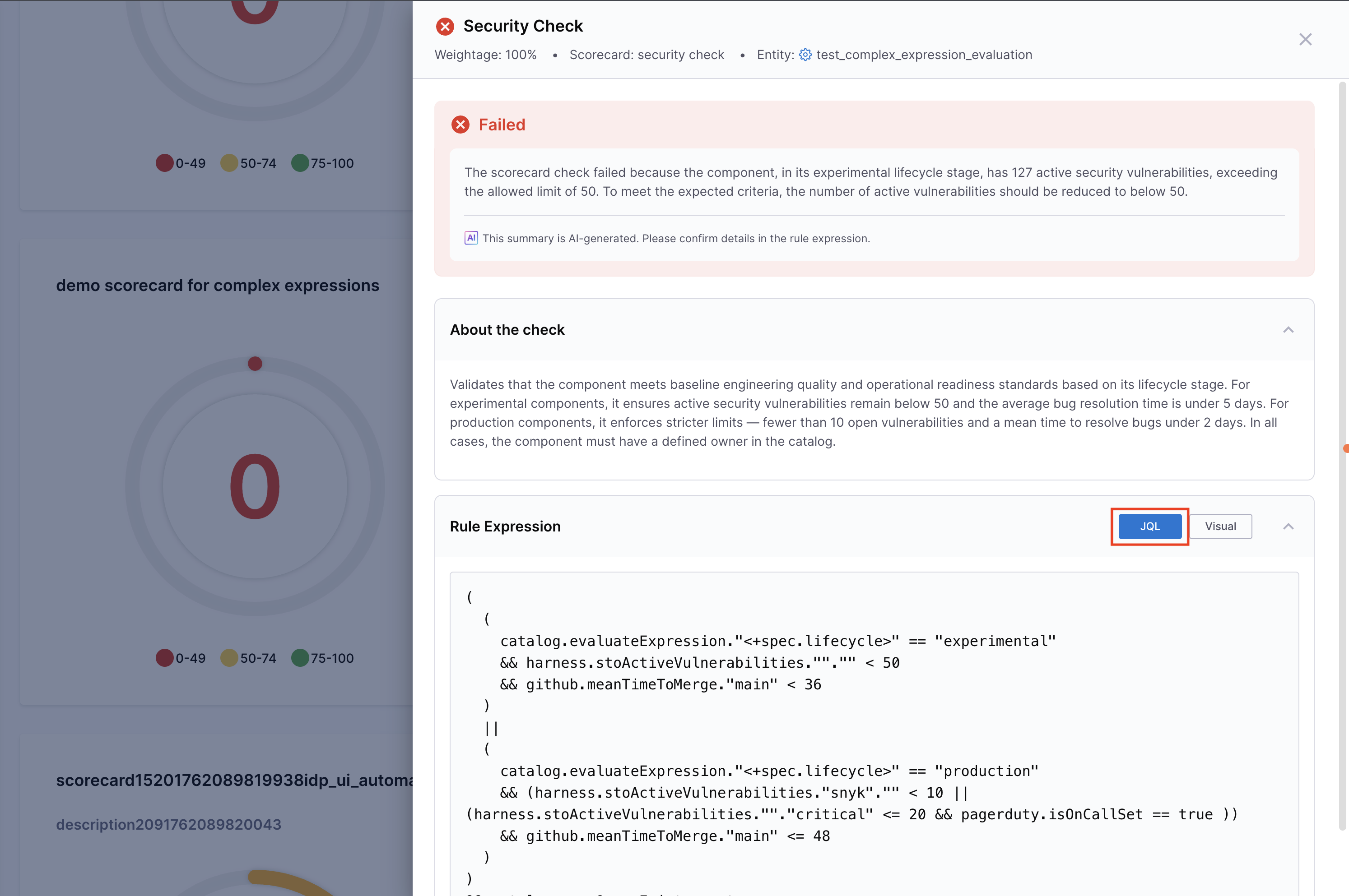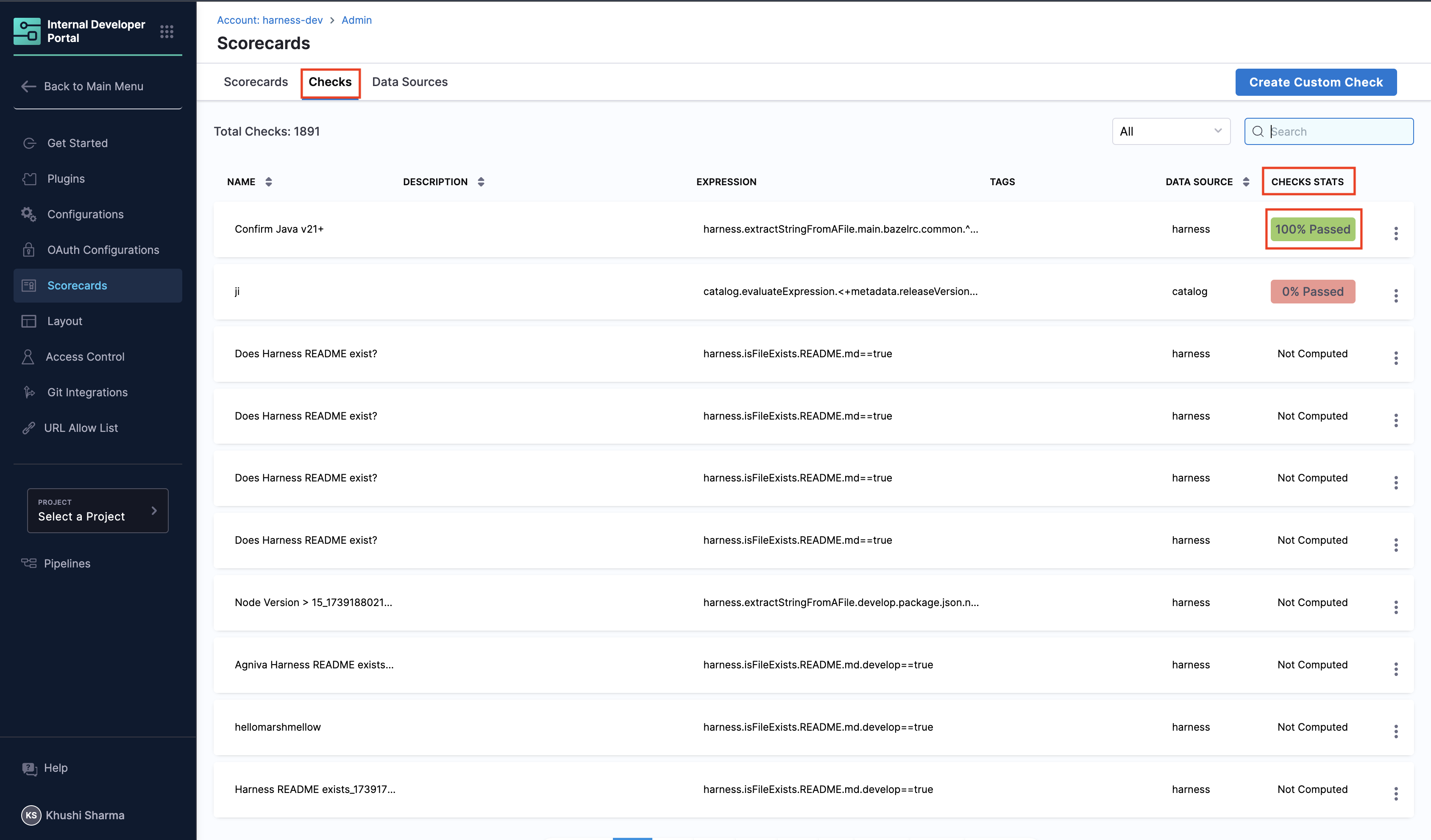 You can view detailed information about each check's execution status directly from the entity's Scorecard view. This helps you understand why a check passed or failed and take appropriate action.