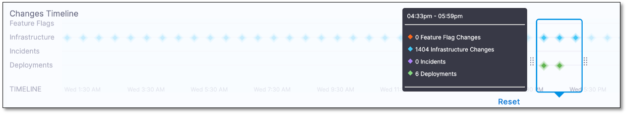To view the change details for a specific time slot, select the time slot on the Changes timeline. A time window appears with the details of all the changes that occurred in that specific time slot. You can change the time slot by using the handles.