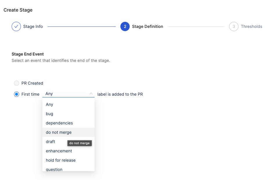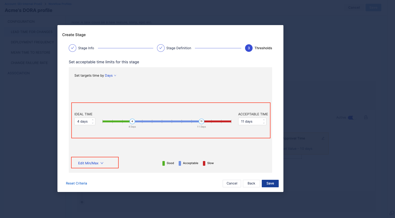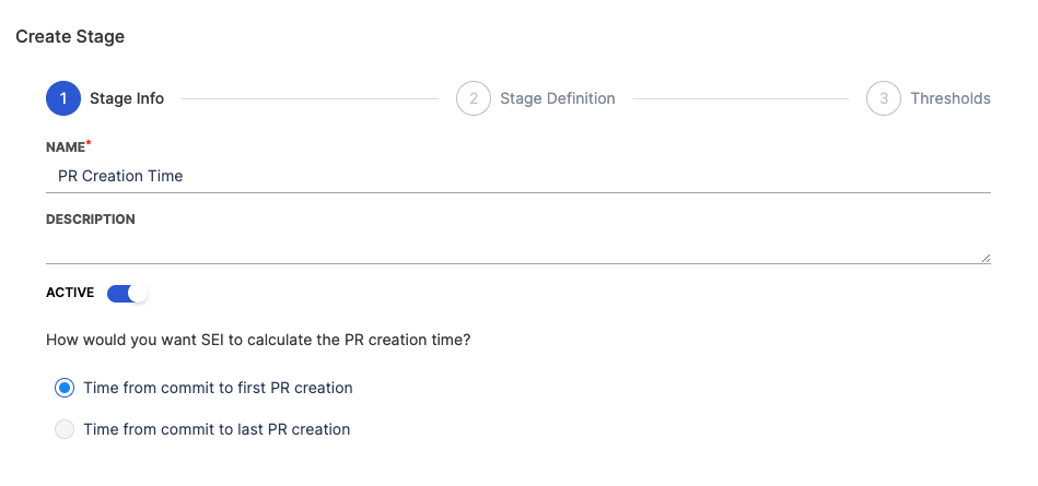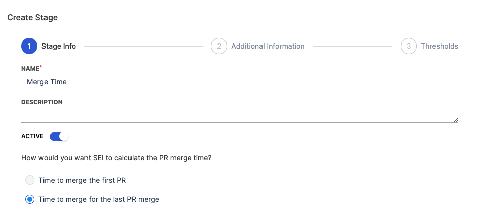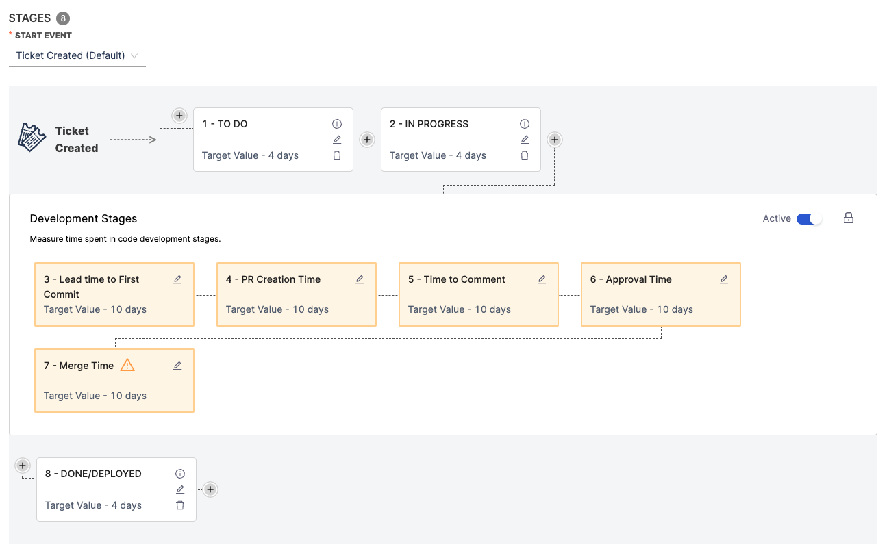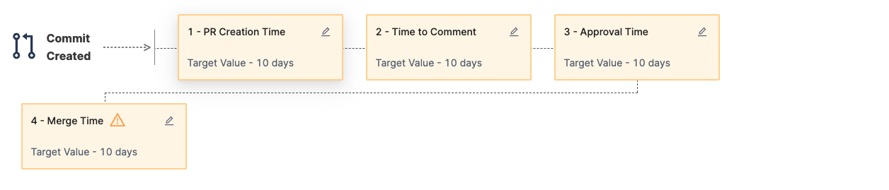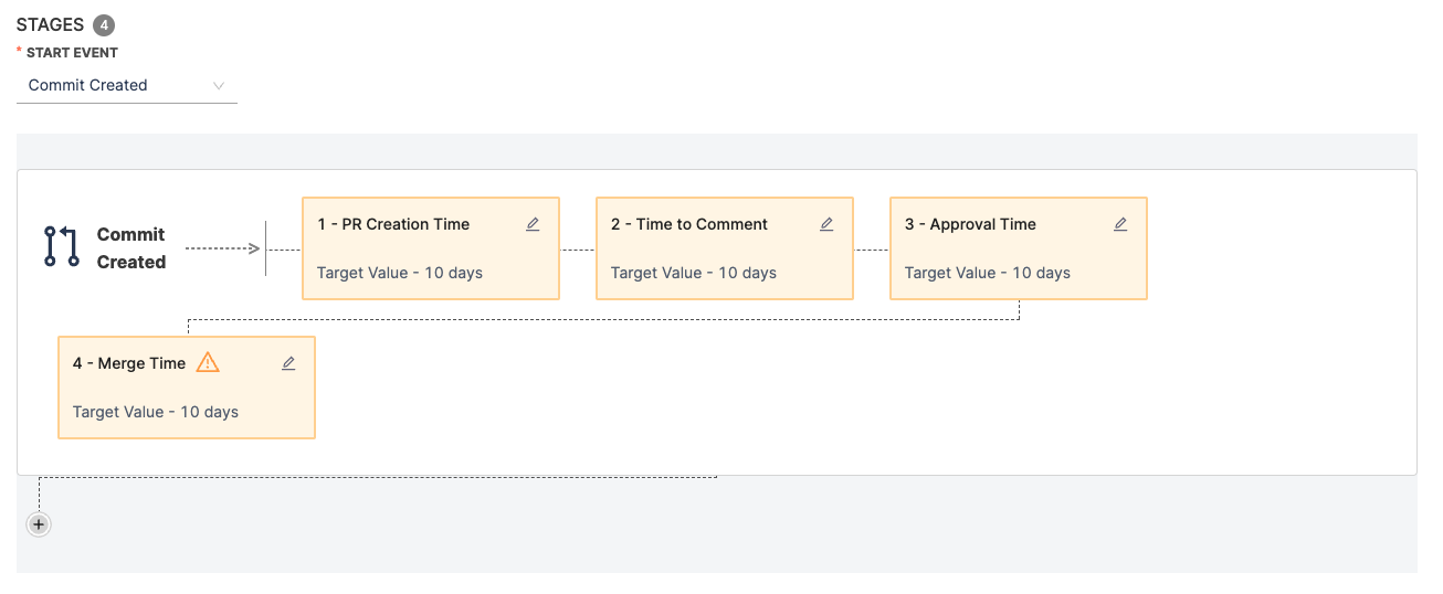 5. Review the pre populated Stages that represent the PR lifecycle, from PR creation to merge. You can edit, add, and remove stages as needed. You can edit the data or fields that drive each stage, set time range goals, and more.